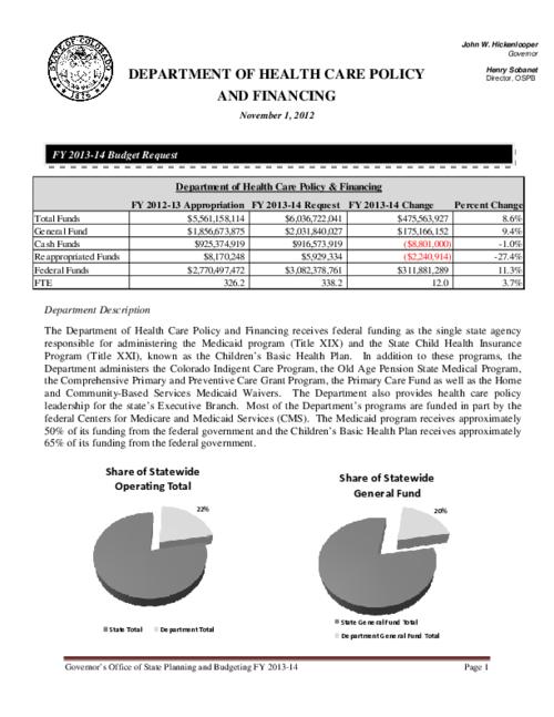 Department of Health Care Policy and Financing FY 2013-14 budget request