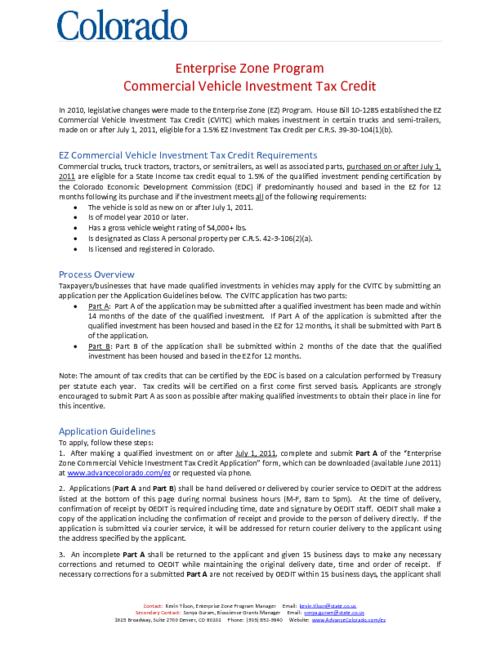 The EZ Commercial Vehicle Investment Tax Credit (CVITC) which makes investment in certain trucks and semi-trailers, made on or after July 1, 2011, eligible for a 1.5% EZ Investment Tax Credit.