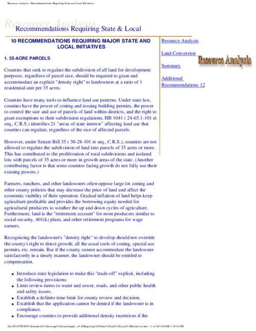 Ten recommendations requiring major state and local initiatives Recommendations requiring state & local resource analysis (At head of title)